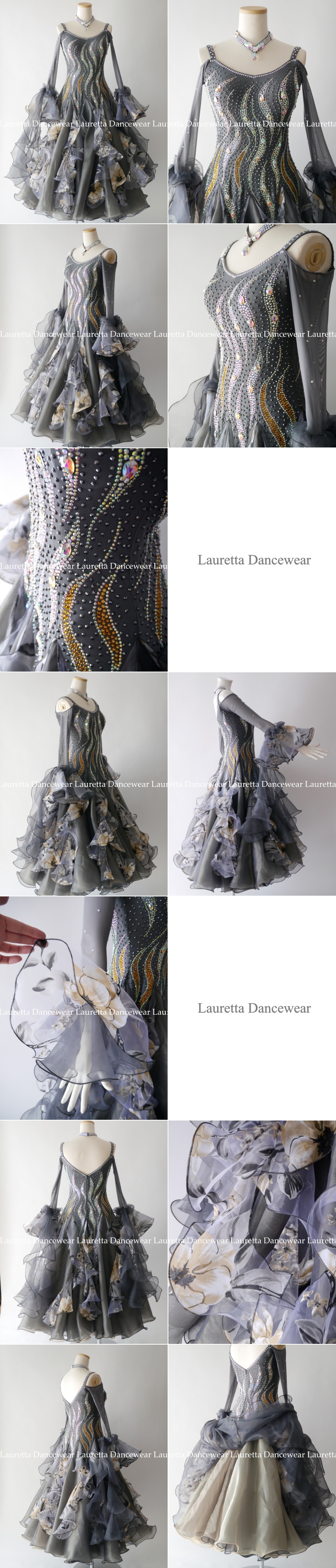 シックで洗練されたグレーを基調に、流れるようなラインストーン装飾が施されたエレガントなドレスです