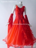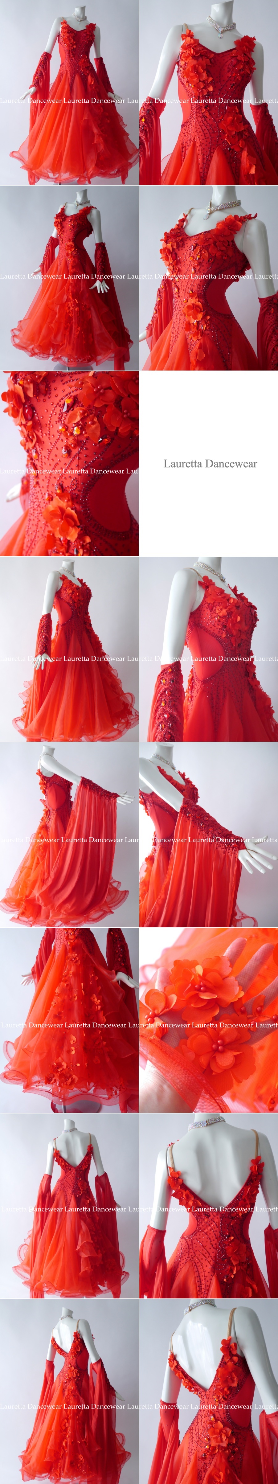 視線を奪う、ルビーレッド。華やかエレガントなドレスです。大きなフロートがダンスを躍動的に!