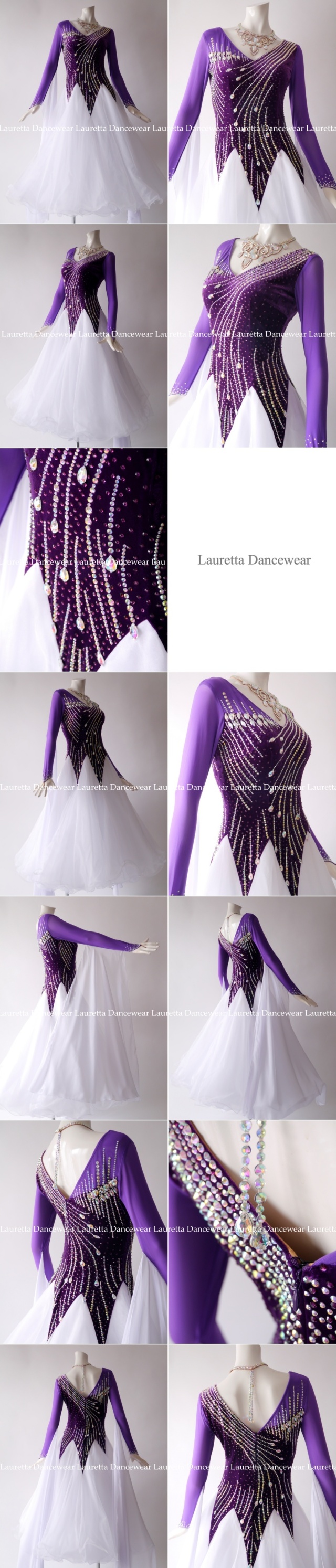 気品漂うパープルのベロアに白いスカートを合わせた、優美で柔らかな印象のドレスです。